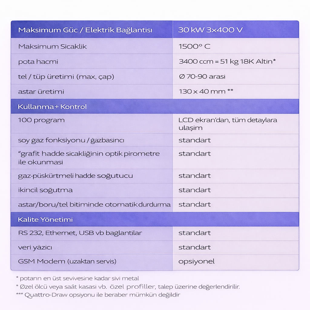 Değerli madenlerin kontinü dökümü için kullanılan bu modern dikey kontinü döküm makinesi hemen hemen tüm üretim kapasiteleri için mükemmel sonuçlar verir. Mikro işlemci kontrollü indüksiyon jeneratörü ile donatılmış Alman teknoloji ürünü bu sürekli döküm makinesi, optimize edilmiş sıcaklık kontrolü ile 1500 ºCye kadar indüksiyon ısıtma sistemiyle, koruyucu gaz atmosferi altında eritme ve ayar sorunu yaşatmayacak şekilde mükemmel metal karışımını sağlamaktadır.