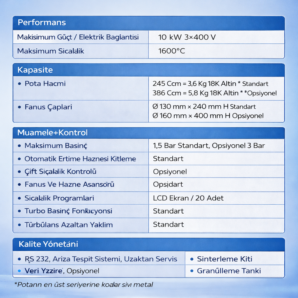 Büyük üretim miktarlarının söz konusu olduğu hızlı ve art arda sürekli döküm işlemlerinde, daha geniş potalar ve fanus kapasiteleriyle (Ø160 x 400 mm fanuslara kadar) bile yüksek performans elde etmek çok önemlidir. 1600oC’a ulaşan maksimum sıcaklığı, kullanılabilecek metal çeşidinin sınırlarını genişletir. Pota ve fanus sıcaklığı ölçülebildiğinden istenilen sıcaklık değerlerine sıkı sıkıya bağlı kalınır. Eğer alaşımlar çok sık değiştiriliyorsa 20 farklı program imkânı işleri kolaylaştırır. Opsiyonlu veri yazıcısı her bir dökümün parametrelerini kayıt eder (ISO 9001).