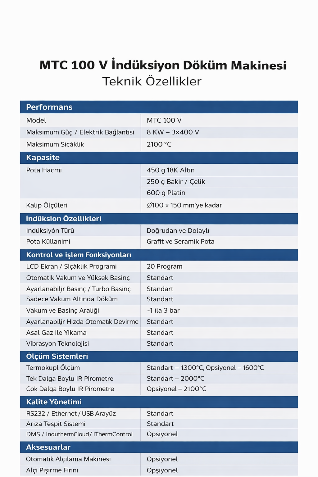 En önemli teknik veriler; 250 g çelik veya 600 g Pt eritme kapasitesi, Ø100 × 150 mm’ye kadar kalıp boyutları ve maksimum 2100°C ulaşan sıcaklıktır. Tekli veya opsiyonel çok dalga boylu kızılötesi pirometre, ayarlanabilir hızda otomatik devirme ve değişken basınç oluşturma özellikleri, optimum proses kontrolü ve sürekli yüksek döküm kalitesi sağlar.