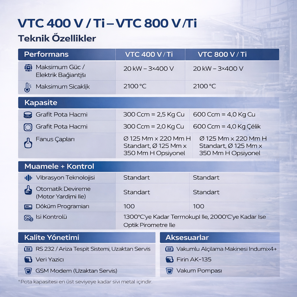 VTC 100 V – VTC 800 V, çok geniş bir uygulama alanına uygun, son derece çok yönlü döküm makineleridir ve bugüne kadar birbiriyle uyumsuz olduğu düşünülen çeşitli seçenekleri bir arada sunar. VTC serisi başlangıçta çelik, paladyum, platin vb. (maks. 2.000°C) dökümü için yüksek sıcaklık makinesi olarak tasarlanmış olsa da, büyük kalıp kapasiteleri sayesinde altın, gümüş, bakır, alüminyum ve diğer malzemelerin ekonomik üretimi için de uygundur.